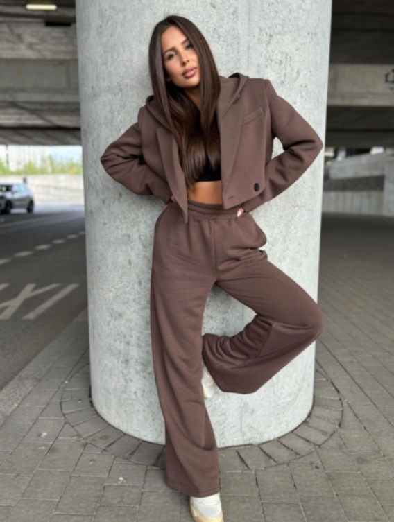 Fantastyczny komplet , składający się z dresowych spodni i marynarki z kapturem w pięknym, czekoladowym kolorze.