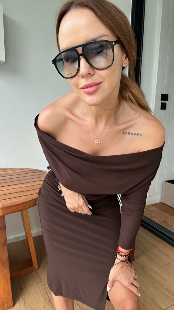 Czekoladowa sukienka Florence z regulowanym dekoltem i rozporkiem.